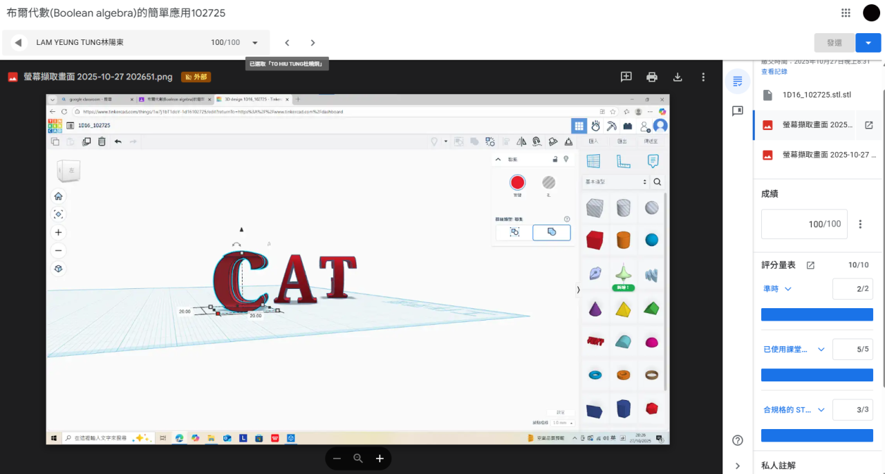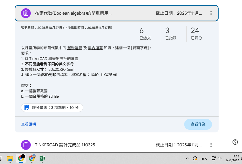 2025年6月20日,數學科與應用科技科,進行了一次誇學科工作坊,是次活動,初中級同學在數學科中學會:透視圖的應用 (正視圖、俯視圖、左視圖、右視圖),以及布爾代數 (Boolean Algebra) 的入門理論,而應用科技科,則學會應用3D打印機的技巧,透過今次活動,同學發揮創意,成功製造出各款不同的小禮物。