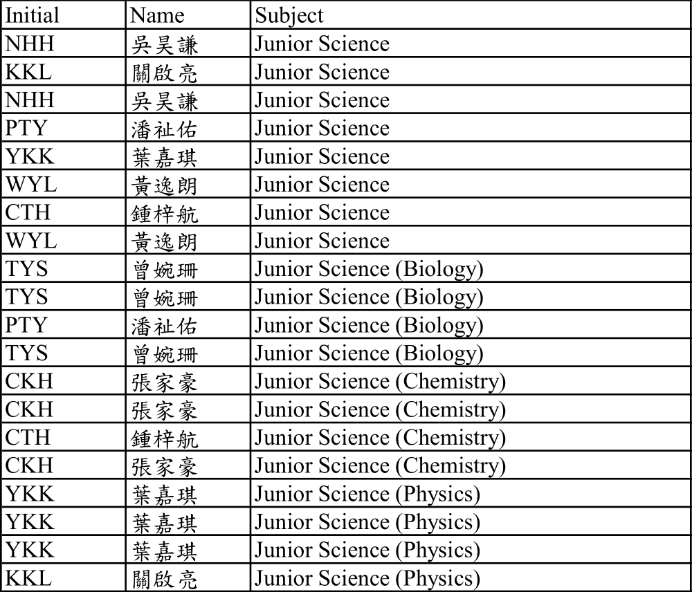 中一級 | 羅洛軒 陳彥延 | 朱晉霆 江曉晴 | 曾曉晴 李嘉穎 | 黃樹東 麥善媄 |