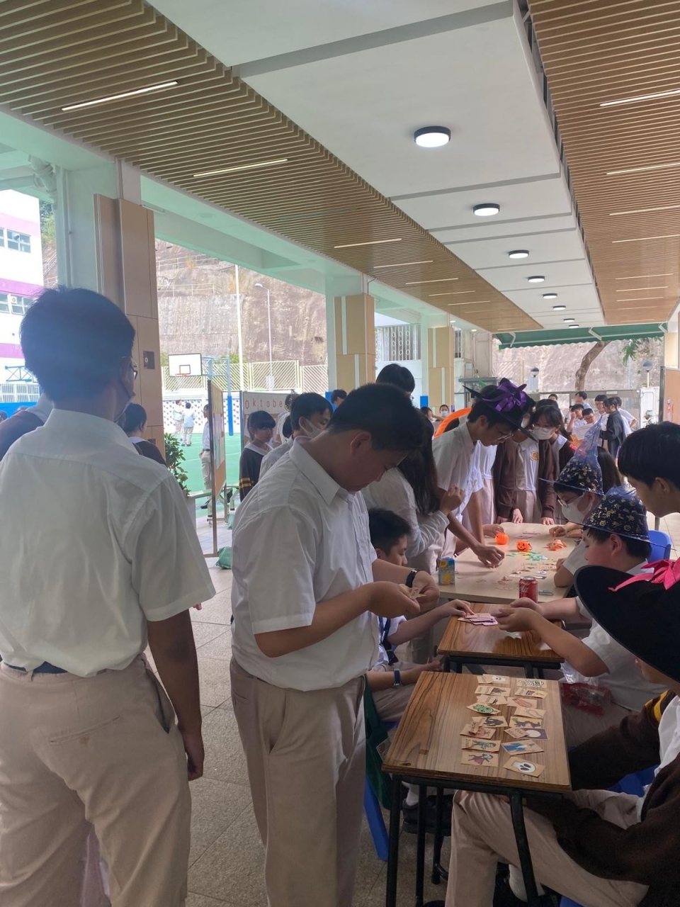 Our NET teacher Mr. Ray also organized many game booths in the playground. Making paper spiders, throwing toy pumpkins and grabbing creepy crawling critters, the students were learning vocabulary while playing.