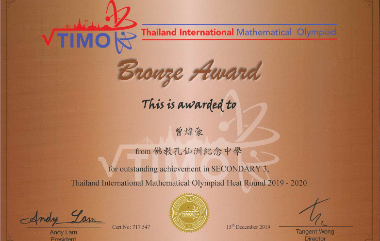 恭喜以下各得獎同學,此外我校再有 9 位同學參加了 TIMO 泰國國際數學競賽晉級賽,祝願我校同學能再下一城,繼續奪獎而回。