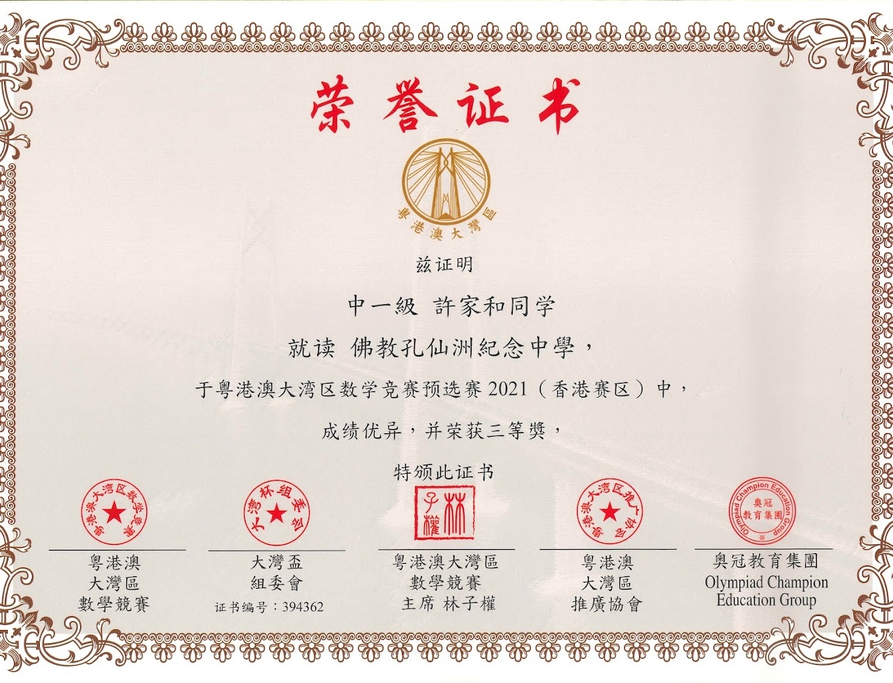 恭喜 1D 胡皓軒 同學及 4B 梁日晉 同學,兩位同學於 3 月期間,代表學校出席於澳門舉辦的大灣盃決賽,兩人最終分別獲得三等獎及優異獎而回。