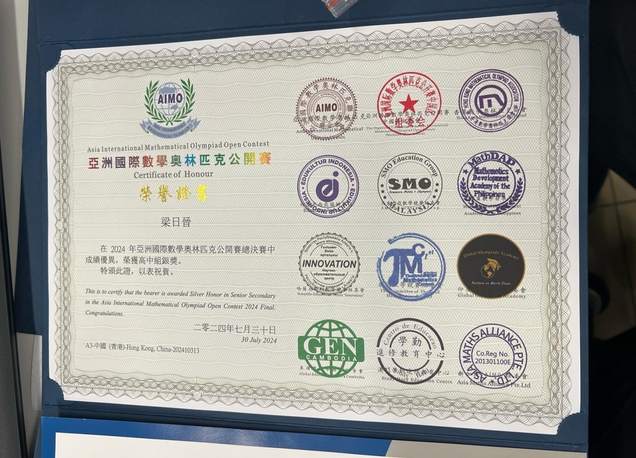 此外以上 9 位同學,均可代表學校,在2024年8月,遠赴韓國,出席 AIMO 總決賽,並與世界各地的選手,交流數學解難的心得,擴闊學習的視野。
