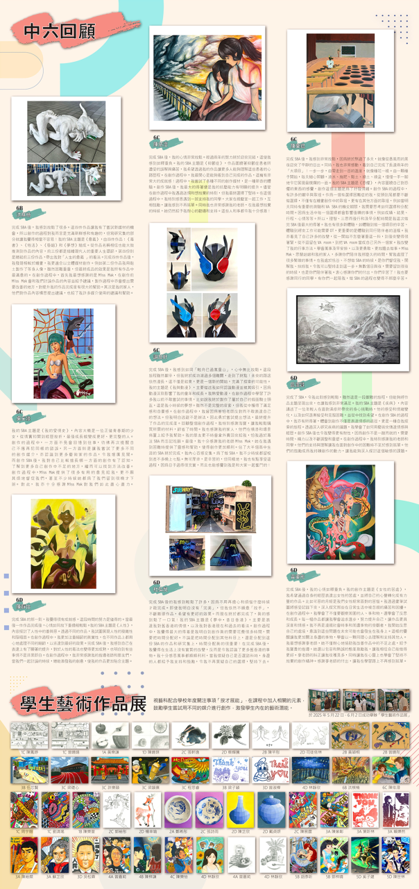 | 中一至中三 | 藝術點滴薄 | 1/每循環週 | 1. 老師檢視 2. 學期評分 | 透過藝術資料搜集、素描練習,讓學生對課題作預習及持久鍛鍊基本視覺表達能力。 |