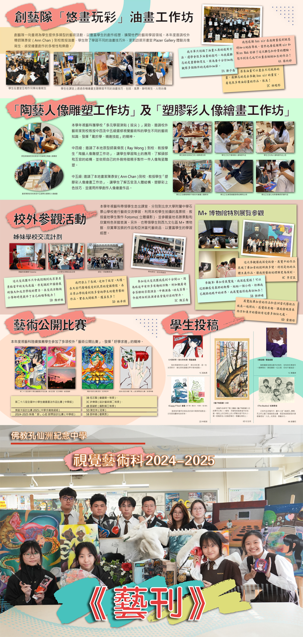 視覺藝術科於每個學年編製《藝刊》,以介紹中六級學生SBA的作品及成果、各級學生的藝術活動、學生親自撰寫的感想及學生的投稿作品等,以達致互相欣賞及分享所學,塑造學生正面的個人特質,確立正念覺醒的價值觀,也讓師生及家長更了解本科的發展。