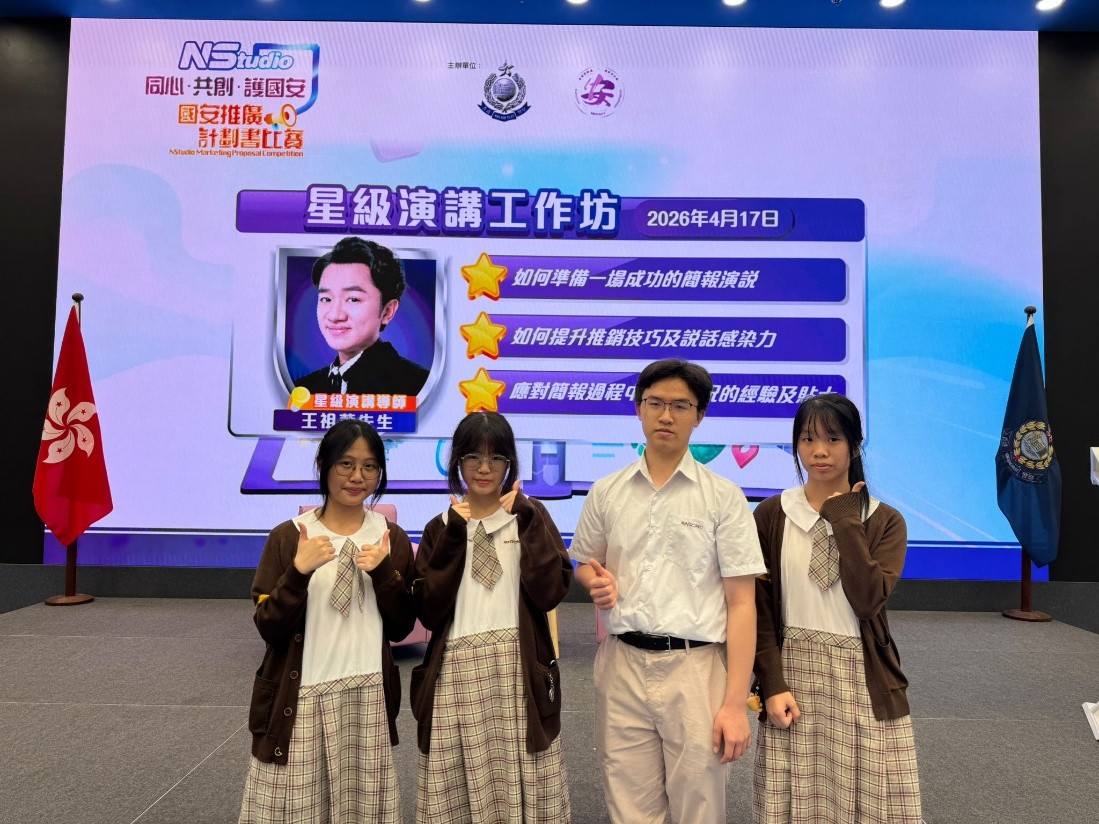 我校4A班四位助理總領袖生——吳松霖、何嘉茵、蒲彥霏及吳家慧同學,於香港警務處國家安全處主辦的 「NStudio 同心・共創・護國安」國安推廣計劃書比賽 中表現卓越,成功晉級全港決賽階段,成為高中組僅24隊決賽隊伍之一,成績令人鼓舞!